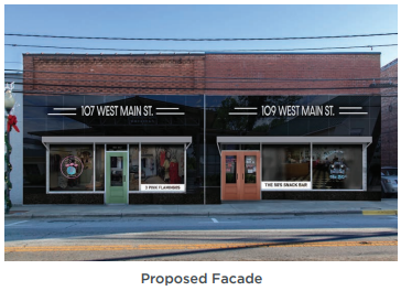 107 & 109 West Main Street are contributing buildings in the downtown Wilkesboro Historic District. Both are single story brick commercial properties with parapet roofs, brick bulkheads, and replacement aluminum framed display windows and doors. The building at 107 was constructed prior to 1929 and features a corbeled brick cornice with terra cotta coping and recessed sign board at the upper facade. The lower facade is flush with the face of the building and clad in faux stone at an unknown date. The middle facade has been faced with black carrara glass. The building at 109 was constructed in 1920 and features a simple brick parapet with metal coping at the upper facade. The storefront is recessed at an angle. It too has been clad in faux stone and black carrara glass at the lower and middle facades, respectively. 107 W. Main St. is currently occupied by the Three Pink Flamingos Boutique, a Woman’s clothing store. 109 W. Main St. is currently occupied by the 50’s Snack Bar, a restaurant. Project Overview Archival Documentation Project Overview 107 & 109 W. Main St. Wilkesboro, NC 1 Because the building facade has been altered multiple times in the past, its design elements span different time periods. We believe the Carrara-type glass above the aluminum storefront once enframed the entire storefront and dates to the historic district’s period of significance. We suspect that the faux stone was added at a later date and replaced worn or damaged glass panels. It is difficult to guess the date of the replacement so it may or may not have been during the period of significance. Developing a rehabilitation plan that meets the Secretary of Interior’s Standards for Historic Rehabilitation in this case is a little beyond the Main Street Fellows’ level of expertise, so we reached out to Jennifer Cathey with the State Historic Preservation Office for guidance. She offered 3 options to meet the Secretary of Interior’s Standards and also expressed concerns regarding stripping the facade down to expose the historic brick.